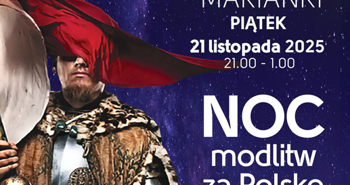 W najbliższy piątek, 21 listopada, zapraszamy na kolejną Noc modlitw za Polskę. Nasze modlitewne czuwanie rozpocznie się Apelem Jasnogórskim o godz. 21:00, a zakończy Mszą Świętą w intencji Ojczyzny odprawionej o północy.